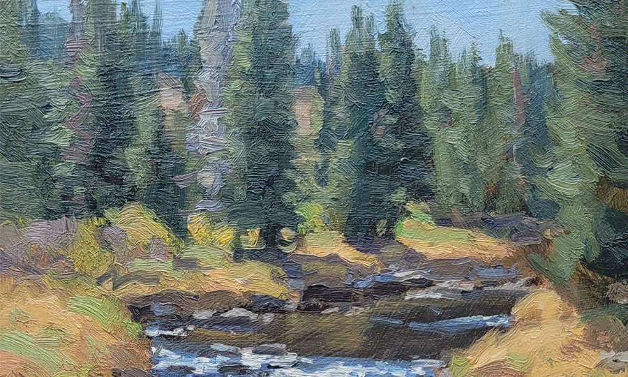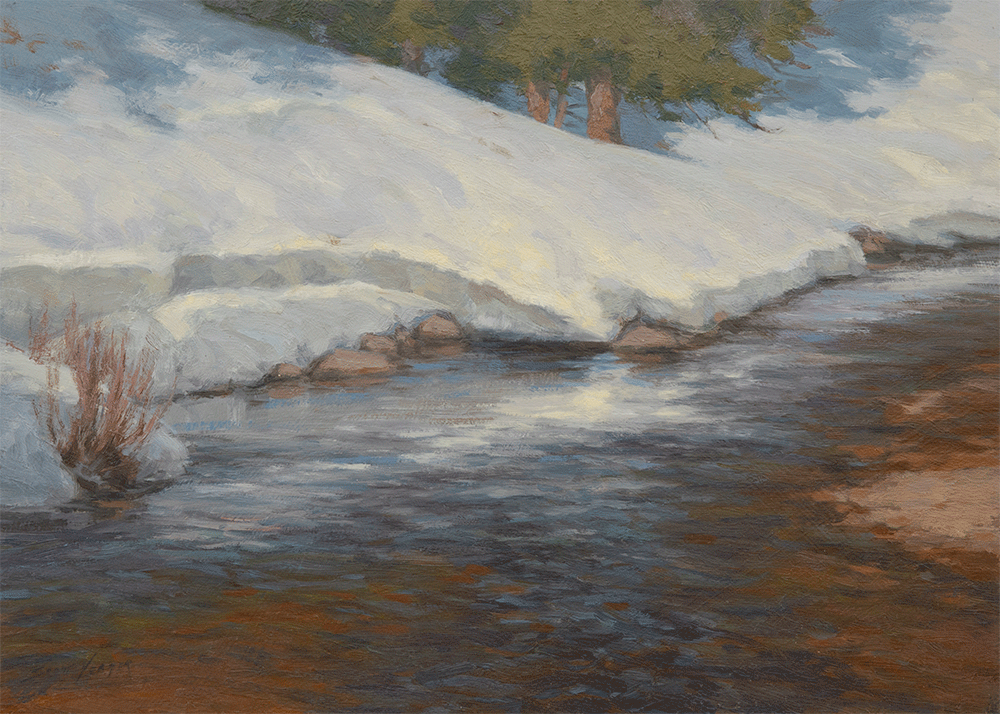 Firsthand experience of the subject is at the core of his work, and he creates a constant flow of plein air paintings as a result. Many of these stand on their own as works of art, and many are the springboard for more developed and larger works in the studio.